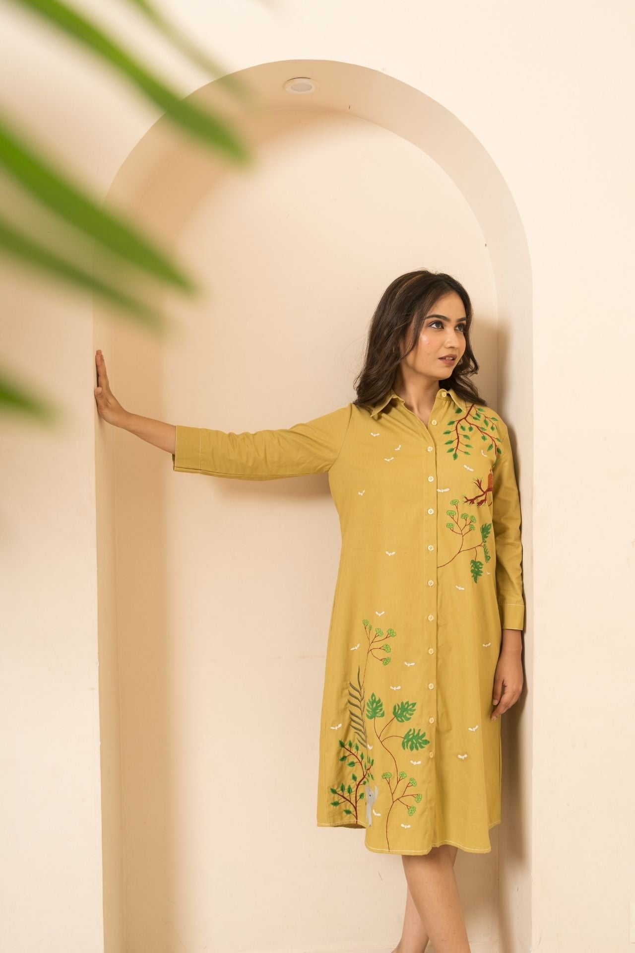 Trees and animals thread embroidered, a-line fit, three quarter sleeves with 1' cuff
